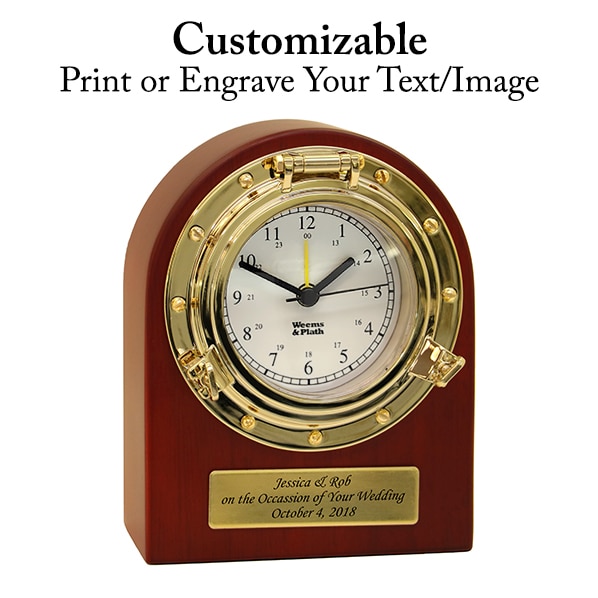 The Porthole Desk Clock looks great from every angle and is perfect for the home or office. Add a custom engraved brass plate to make this a unique gift. This nautical quartz clock features polished brass that will never tarnish and solid Mahogany finished wood with a scratch resistant sole.