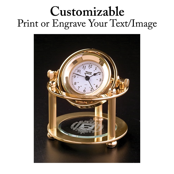 The Solaris brass desk clock is a stunning time-piece that is sure to please the recipient. A precision quartz clock movement is housed in a hand polished, forged brass and marine lacquered case. The gimbaled design allows the clock to swivel for any viewing angle and can be locked in place much like the historic gimbals that allowed clocks to travel safely at sea centuries ago. This show-stopper brass desk clock stands on three solid legs, and below, the beveled glass crystal (surrounded by a ring of brass) can be etched to create an elegant personalized gift.